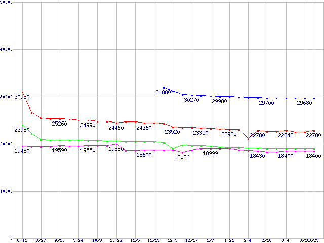 | Socket 478 (FC-PGA2,FSB 800MHz,L2 1MB,Hyper-Threading,Prescott)の最安値推移 | | | (2004年8月11日~2005年3月25日) |