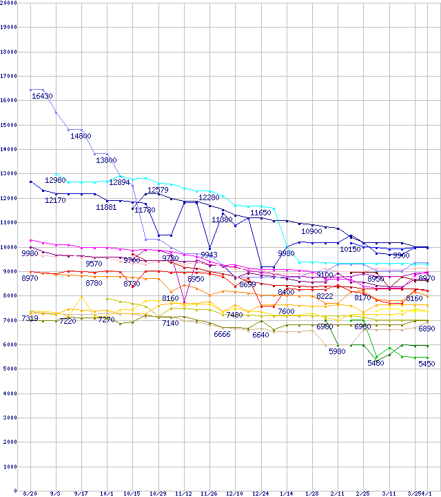 | CPU主要製品(最安値1万円未満)の最安値推移 | | | (2004年8月20日~2005年4月1日) |