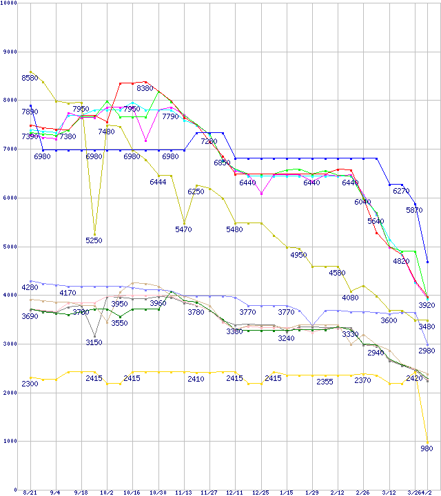 メモリ主要製品(最安値5千円未満)の最安値推移