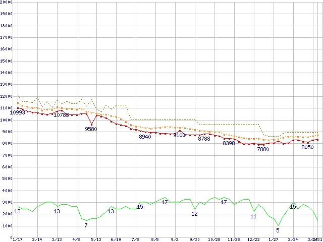 ※このグラフは過去のデータも税率5%相当に調整した税込み相当額のグラフです。 税率変更や、総額表示方式導入(2004年4月)の影響は除いています。 | | | ●凡例 | 最安値 (点線部は販売店未確認 または未調査) | 平均値 | 最高値 | ショップ数 |