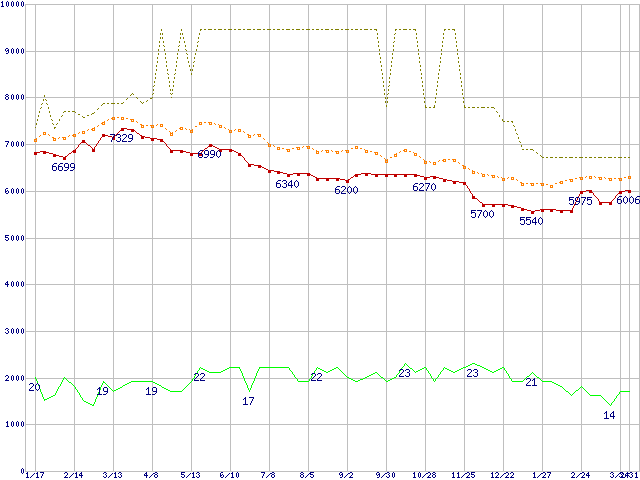 ※このグラフは過去のデータも税率5%相当に調整した税込み相当額のグラフです。 税率変更や、総額表示方式導入(2004年4月)の影響は除いています。 | | | ●凡例 | 最安値 (点線部は販売店未確認 または未調査) | 平均値 | 最高値 | ショップ数 |