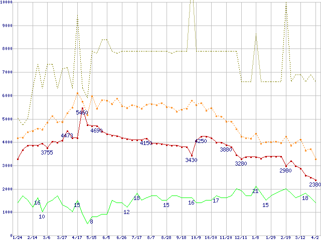 PC3200(DDR400) DDR SDRAM DIMMの最安値推移