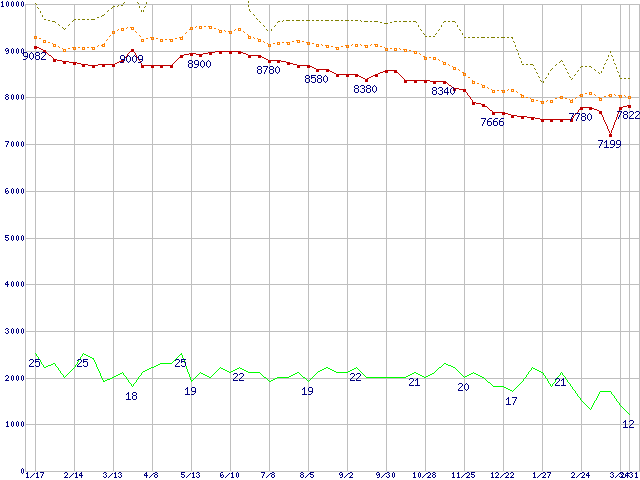 ※このグラフは過去のデータも税率5%相当に調整した税込み相当額のグラフです。 税率変更や、総額表示方式導入(2004年4月)の影響は除いています。 | | | ●凡例 | 最安値 (点線部は販売店未確認 または未調査) | 平均値 | 最高値 | ショップ数 |