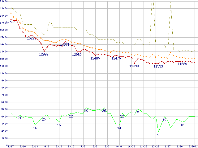 ※このグラフは過去のデータも税率5%相当に調整した税込み相当額のグラフです。 税率変更や、総額表示方式導入(2004年4月)の影響は除いています。 | | | ●凡例 | 最安値 (点線部は販売店未確認 または未調査) | 平均値 | 最高値 | ショップ数 |