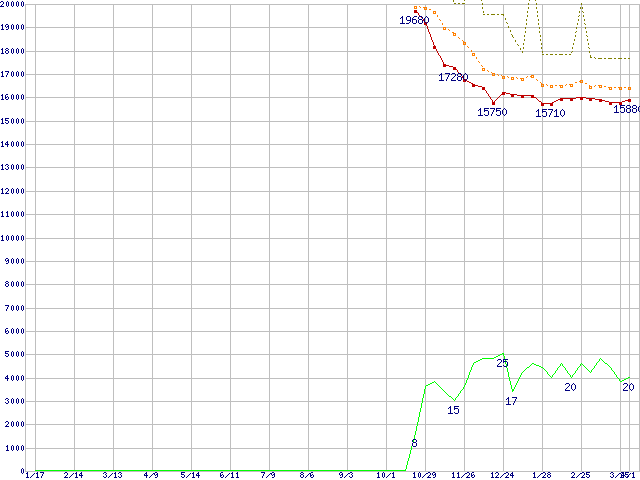 ※このグラフは過去のデータも税率5%相当に調整した税込み相当額のグラフです。 税率変更や、総額表示方式導入(2004年4月)の影響は除いています。 | | | ●凡例 | 最安値 (点線部は販売店未確認 または未調査) | 平均値 | 最高値 | ショップ数 |