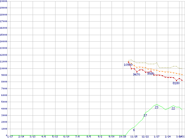 ※このグラフは過去のデータも税率5%相当に調整した税込み相当額のグラフです。 税率変更や、総額表示方式導入(2004年4月)の影響は除いています。 | | | ●凡例 | 最安値 (点線部は販売店未確認 または未調査) | 平均値 | 最高値 | ショップ数 |
