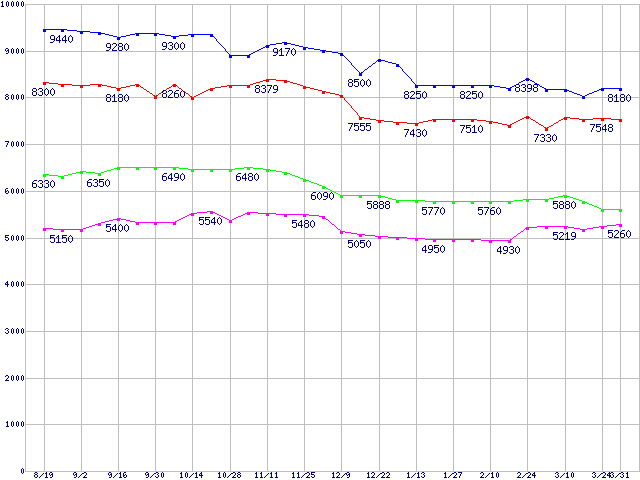 | Barracuda 7200.7 (7200rpm,Ultra ATA/100,2MB,80GB/Platter)の最安値推移 | | | (2004年8月19日~2005年3月31日) |