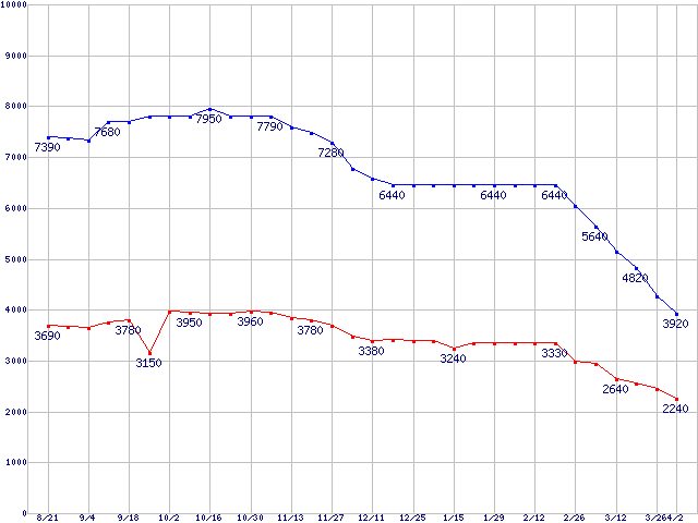 PC2 5300(DDR2 667) DDR2 SDRAM DIMMの最安値推移