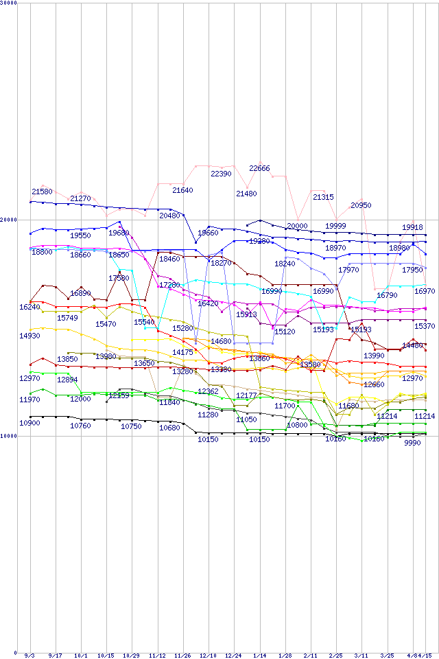 | CPU主要製品(最安値1万円~2万円未満)の最安値推移 | | | (2004年9月3日~2005年4月15日) |