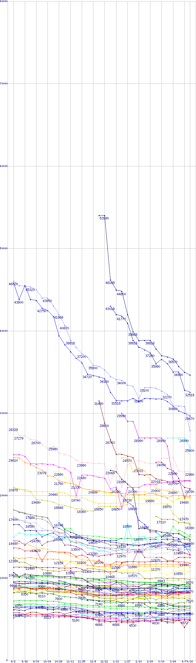 [前グラフ]:HDD主要製品(最安値2万円以上)の最安値推移
