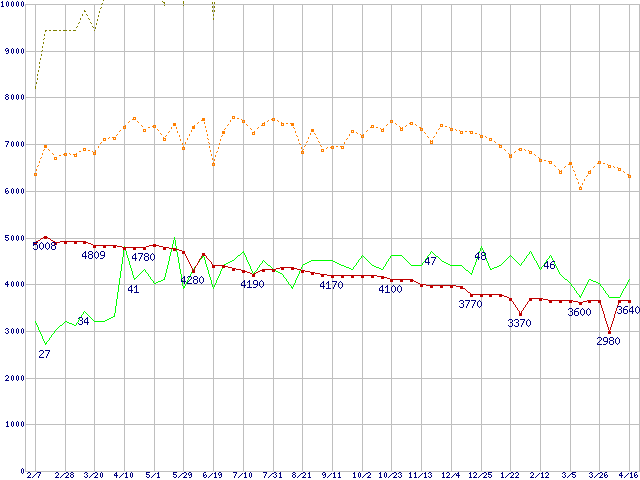 ※このグラフは過去のデータも税率5%相当に調整した税込み相当額のグラフです。 税率変更や、総額表示方式導入(2004年4月)の影響は除いています。 | | | ●凡例 | 最安値 (点線部は販売店未確認 または未調査) | 平均値 | 最高値 | ショップ数 |
