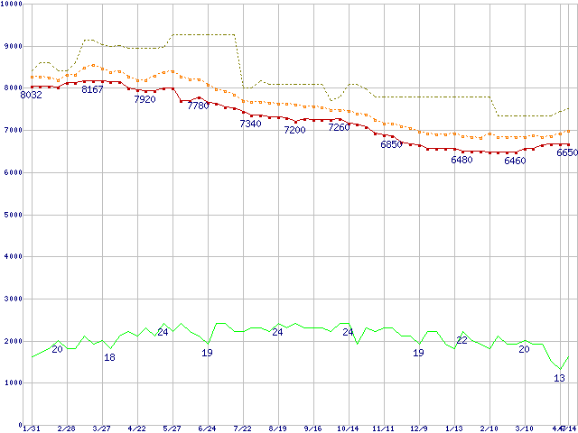 ※このグラフは過去のデータも税率5%相当に調整した税込み相当額のグラフです。 税率変更や、総額表示方式導入(2004年4月)の影響は除いています。 | | | ●凡例 | 最安値 (点線部は販売店未確認 または未調査) | 平均値 | 最高値 | ショップ数 |