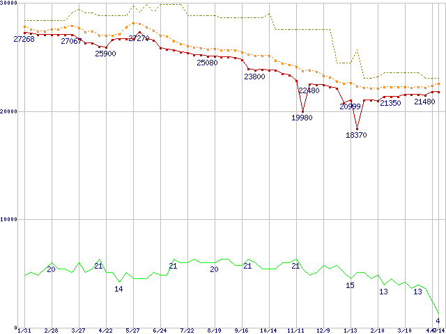 ※このグラフは過去のデータも税率5%相当に調整した税込み相当額のグラフです。 税率変更や、総額表示方式導入(2004年4月)の影響は除いています。 | | | ●凡例 | 最安値 (点線部は販売店未確認 または未調査) | 平均値 | 最高値 | ショップ数 |