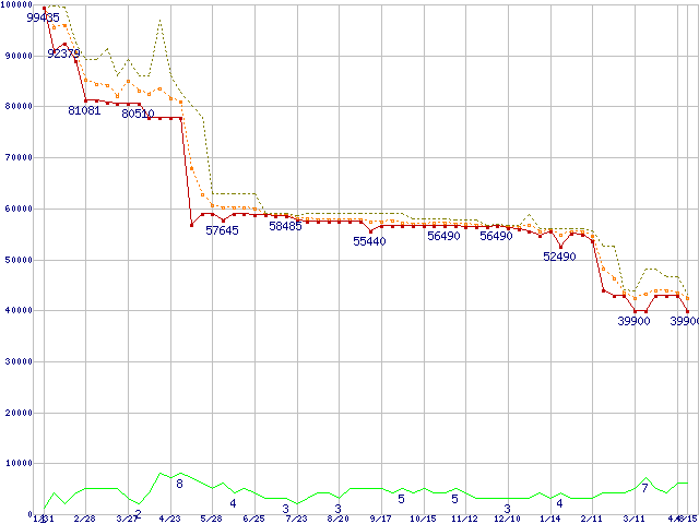 ※このグラフは過去のデータも税率5%相当に調整した税込み相当額のグラフです。 税率変更や、総額表示方式導入(2004年4月)の影響は除いています。 | | | ●凡例 | 最安値 (点線部は販売店未確認 または未調査) | 平均値 | 最高値 | ショップ数 |