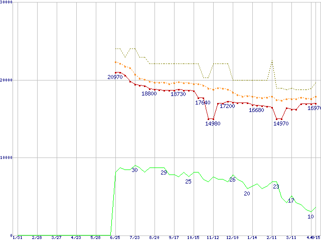 ※このグラフは過去のデータも税率5%相当に調整した税込み相当額のグラフです。 税率変更や、総額表示方式導入(2004年4月)の影響は除いています。 | | | ●凡例 | 最安値 (点線部は販売店未確認 または未調査) | 平均値 | 最高値 | ショップ数 |