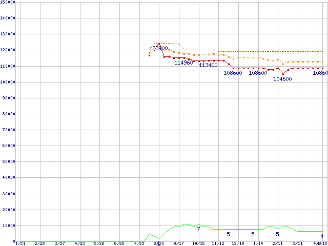 ※このグラフは過去のデータも税率5%相当に調整した税込み相当額のグラフです。 税率変更や、総額表示方式導入(2004年4月)の影響は除いています。 | | | ●凡例 | 最安値 (点線部は販売店未確認 または未調査) | 平均値 | 最高値 | ショップ数 |
