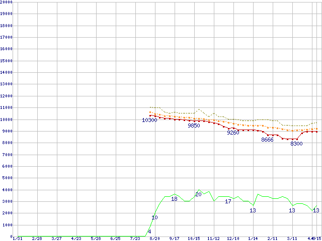 ※このグラフは過去のデータも税率5%相当に調整した税込み相当額のグラフです。 税率変更や、総額表示方式導入(2004年4月)の影響は除いています。 | | | ●凡例 | 最安値 (点線部は販売店未確認 または未調査) | 平均値 | 最高値 | ショップ数 |