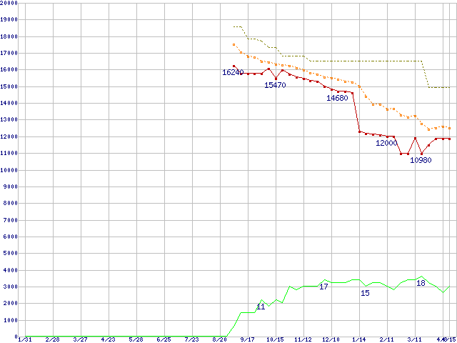 | Celeron M 360 (1.4GHz) リテールパッケージの価格推移 | | | (2004年1月31日~2005年4月15日) |