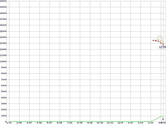 ※このグラフは過去のデータも税率5%相当に調整した税込み相当額のグラフです。 税率変更や、総額表示方式導入(2004年4月)の影響は除いています。 | | | ●凡例 | 最安値 (点線部は販売店未確認 または未調査) | 平均値 | 最高値 | ショップ数 |