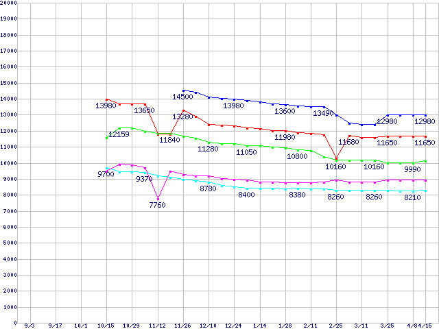 | LGA 775 (FC-LGA42,533MHz,L2 256KB,Prescott,NX bit対応)の最安値推移 | | | (2004年9月3日~2005年4月15日) |