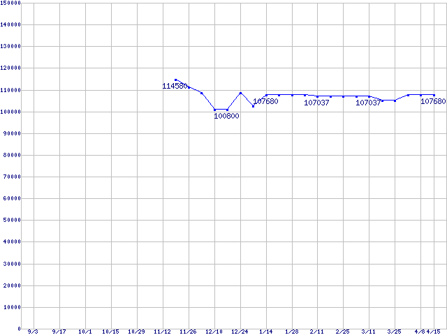 | LGA 775 (FC-LGA4,FSB 1066MHz,L2 512KB,L3 2MB,Hyper-Threading,Gallatin)の最安値推移 | | | (2004年9月3日~2005年4月15日) |