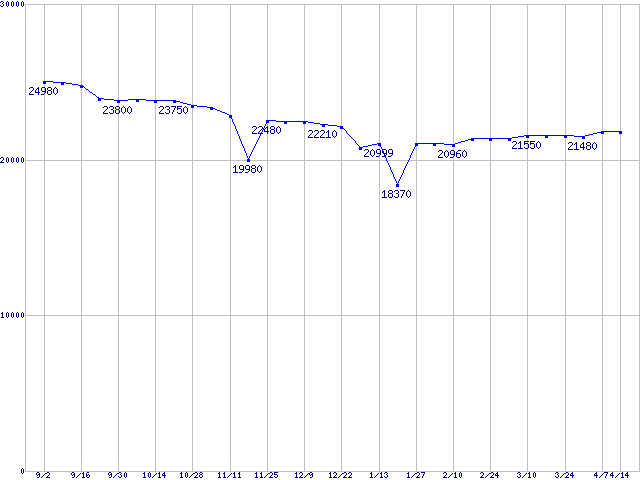 | MaXLine II (5400rpm,Ultra ATA/133,2MB,80GB/Platter,BB)の最安値推移 | | | (2004年9月2日~2005年4月14日) |
