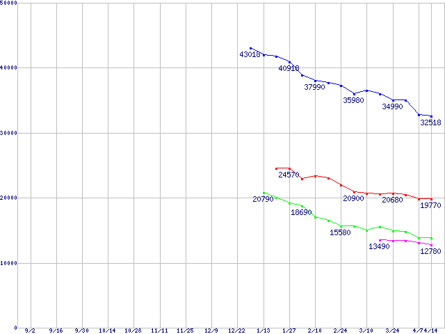 | Barracuda 7200.8 (7200rpm,Ultra ATA/100,133GB/Platter)の最安値推移 | | | (2004年9月2日~2005年4月14日) |