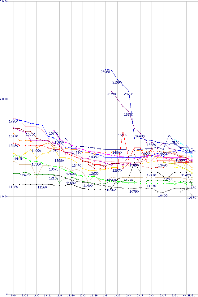 | HDD主要製品(最安値1万円~1万5千円未満)の最安値推移 | | | (2004年9月9日~2005年4月21日) |