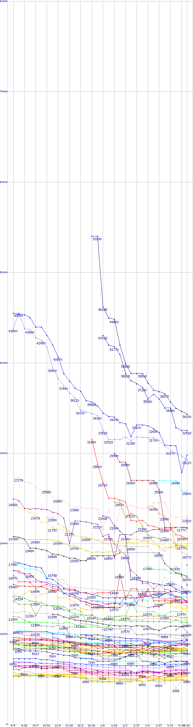 [前グラフ]:HDD主要製品(最安値2万円以上)の最安値推移