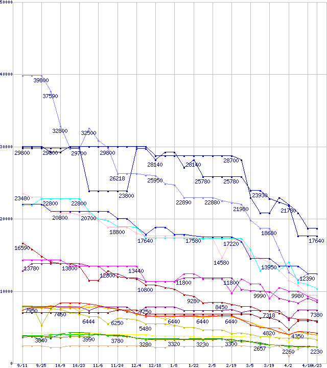 メモリ主要製品の最安値推移