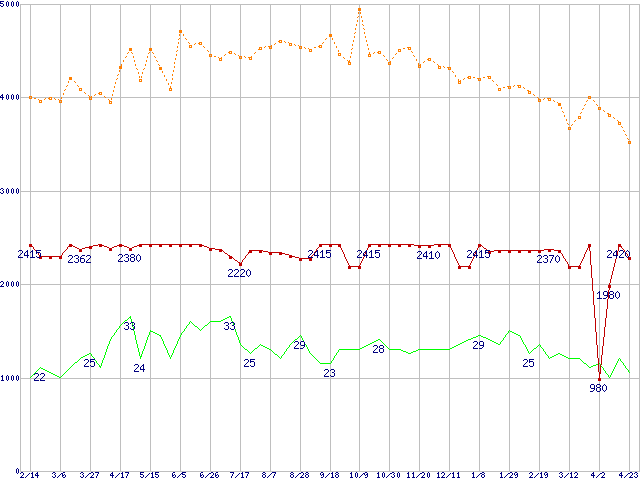 ※このグラフは過去のデータも税率5%相当に調整した税込み相当額のグラフです。 税率変更や、総額表示方式導入(2004年4月)の影響は除いています。 | | | ●凡例 | 最安値 (点線部は販売店未確認 または未調査) | 平均値 | 最高値 | ショップ数 |