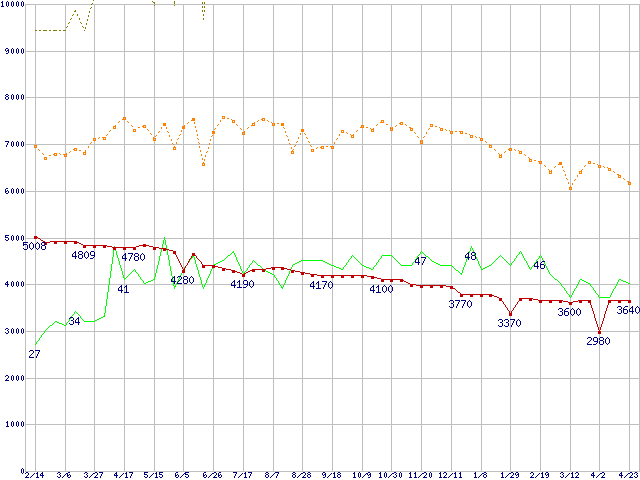 ※このグラフは過去のデータも税率5%相当に調整した税込み相当額のグラフです。 税率変更や、総額表示方式導入(2004年4月)の影響は除いています。 | | | ●凡例 | 最安値 (点線部は販売店未確認 または未調査) | 平均値 | 最高値 | ショップ数 |