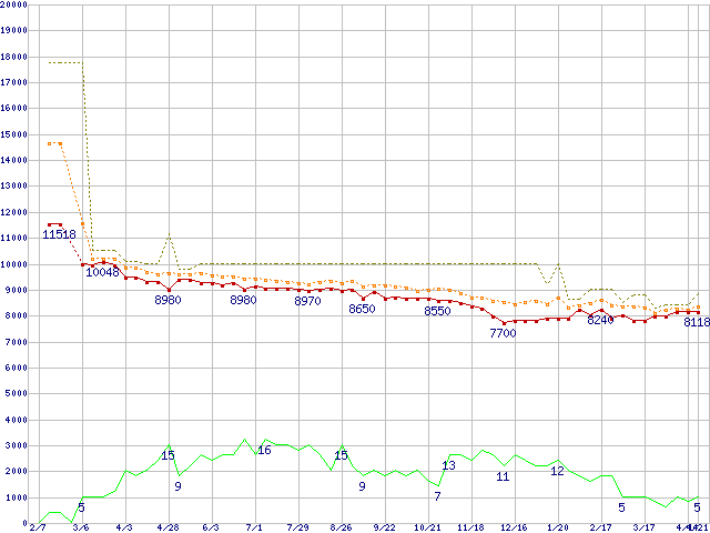 ※このグラフは過去のデータも税率5%相当に調整した税込み相当額のグラフです。 税率変更や、総額表示方式導入(2004年4月)の影響は除いています。 | | | ●凡例 | 最安値 (点線部は販売店未確認 または未調査) | 平均値 | 最高値 | ショップ数 |