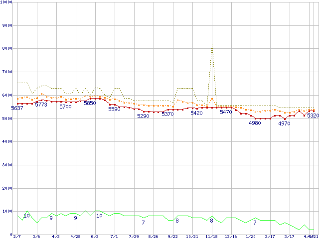 ※このグラフは過去のデータも税率5%相当に調整した税込み相当額のグラフです。 税率変更や、総額表示方式導入(2004年4月)の影響は除いています。 | | | ●凡例 | 最安値 (点線部は販売店未確認 または未調査) | 平均値 | 最高値 | ショップ数 |