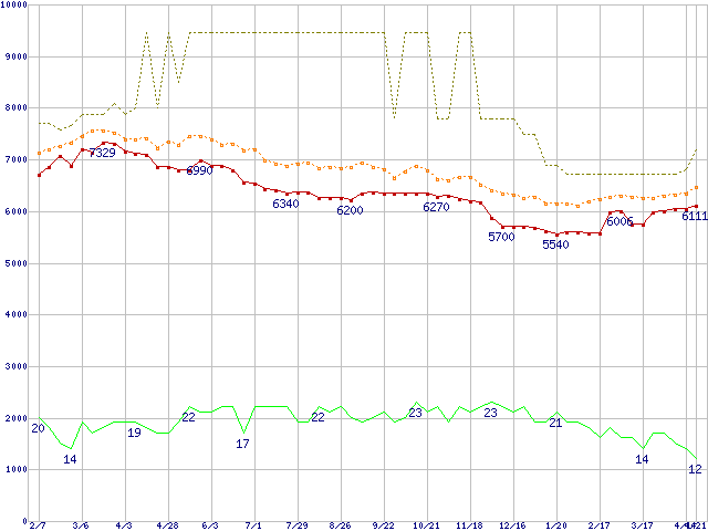 ※このグラフは過去のデータも税率5%相当に調整した税込み相当額のグラフです。 税率変更や、総額表示方式導入(2004年4月)の影響は除いています。 | | | ●凡例 | 最安値 (点線部は販売店未確認 または未調査) | 平均値 | 最高値 | ショップ数 |