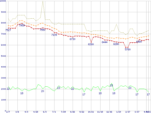 ※このグラフは過去のデータも税率5%相当に調整した税込み相当額のグラフです。 税率変更や、総額表示方式導入(2004年4月)の影響は除いています。 | | | ●凡例 | 最安値 (点線部は販売店未確認 または未調査) | 平均値 | 最高値 | ショップ数 |