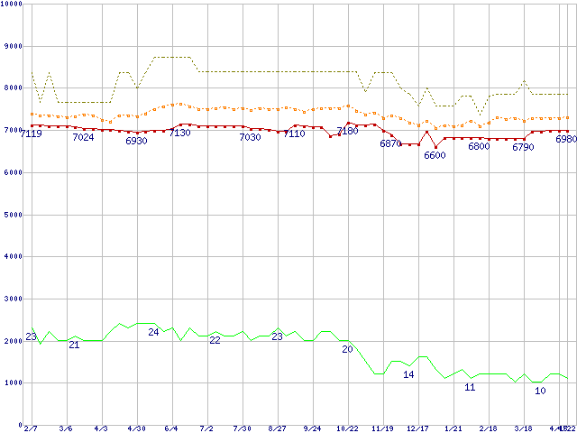 ※このグラフは過去のデータも税率5%相当に調整した税込み相当額のグラフです。 税率変更や、総額表示方式導入(2004年4月)の影響は除いています。 | | | ●凡例 | 最安値 (点線部は販売店未確認 または未調査) | 平均値 | 最高値 | ショップ数 |