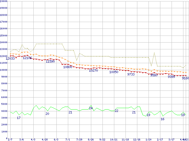 ※このグラフは過去のデータも税率5%相当に調整した税込み相当額のグラフです。 税率変更や、総額表示方式導入(2004年4月)の影響は除いています。 | | | ●凡例 | 最安値 (点線部は販売店未確認 または未調査) | 平均値 | 最高値 | ショップ数 |