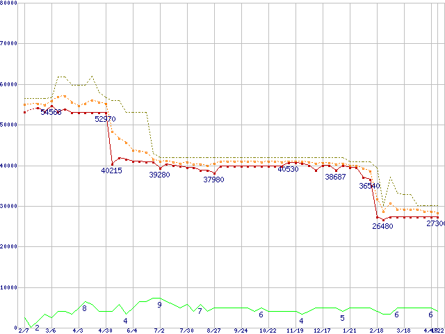※このグラフは過去のデータも税率5%相当に調整した税込み相当額のグラフです。 税率変更や、総額表示方式導入(2004年4月)の影響は除いています。 | | | ●凡例 | 最安値 (点線部は販売店未確認 または未調査) | 平均値 | 最高値 | ショップ数 |