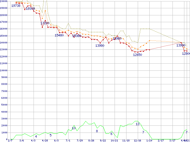 ※このグラフは過去のデータも税率5%相当に調整した税込み相当額のグラフです。 税率変更や、総額表示方式導入(2004年4月)の影響は除いています。 | | | ●凡例 | 最安値 (点線部は販売店未確認 または未調査) | 平均値 | 最高値 | ショップ数 |
