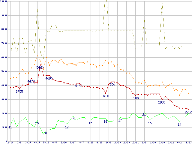 PC3200(DDR400) DDR SDRAM DIMMの最安値推移