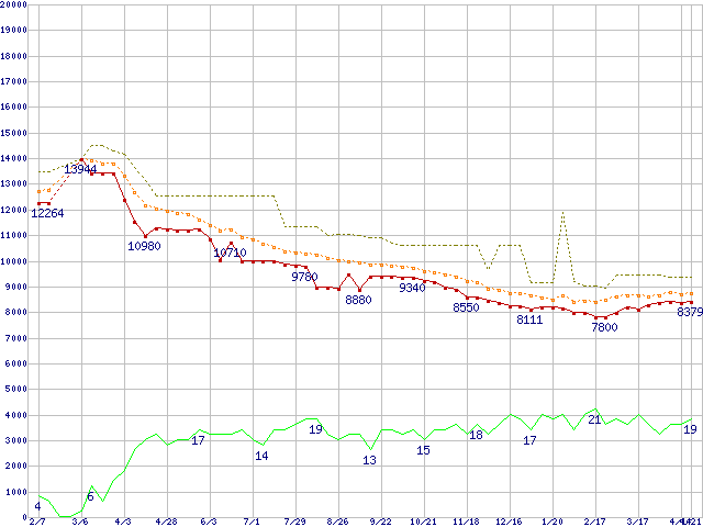 ※このグラフは過去のデータも税率5%相当に調整した税込み相当額のグラフです。 税率変更や、総額表示方式導入(2004年4月)の影響は除いています。 | | | ●凡例 | 最安値 (点線部は販売店未確認 または未調査) | 平均値 | 最高値 | ショップ数 |