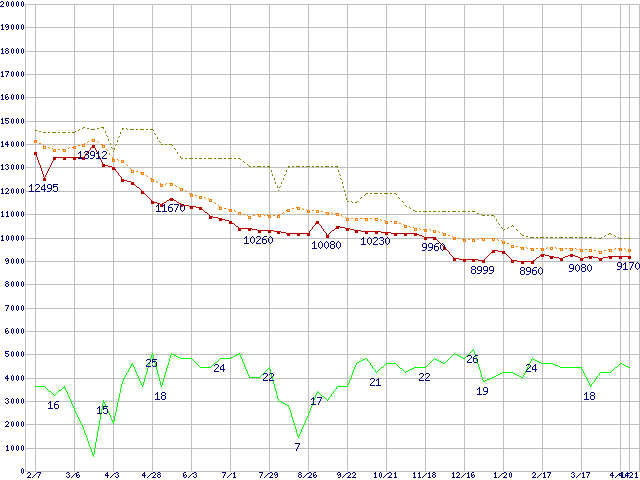 ※このグラフは過去のデータも税率5%相当に調整した税込み相当額のグラフです。 税率変更や、総額表示方式導入(2004年4月)の影響は除いています。 | | | ●凡例 | 最安値 (点線部は販売店未確認 または未調査) | 平均値 | 最高値 | ショップ数 |