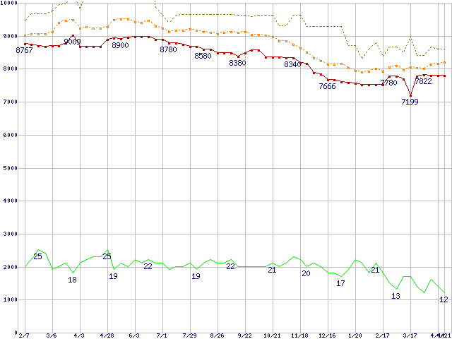 ※このグラフは過去のデータも税率5%相当に調整した税込み相当額のグラフです。 税率変更や、総額表示方式導入(2004年4月)の影響は除いています。 | | | ●凡例 | 最安値 (点線部は販売店未確認 または未調査) | 平均値 | 最高値 | ショップ数 |