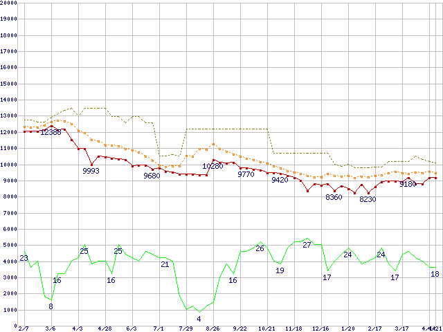※このグラフは過去のデータも税率5%相当に調整した税込み相当額のグラフです。 税率変更や、総額表示方式導入(2004年4月)の影響は除いています。 | | | ●凡例 | 最安値 (点線部は販売店未確認 または未調査) | 平均値 | 最高値 | ショップ数 |
