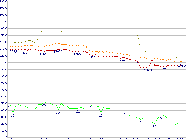 ※このグラフは過去のデータも税率5%相当に調整した税込み相当額のグラフです。 税率変更や、総額表示方式導入(2004年4月)の影響は除いています。 | | | ●凡例 | 最安値 (点線部は販売店未確認 または未調査) | 平均値 | 最高値 | ショップ数 |