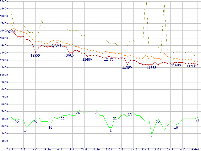 ※このグラフは過去のデータも税率5%相当に調整した税込み相当額のグラフです。 税率変更や、総額表示方式導入(2004年4月)の影響は除いています。 | | | ●凡例 | 最安値 (点線部は販売店未確認 または未調査) | 平均値 | 最高値 | ショップ数 |