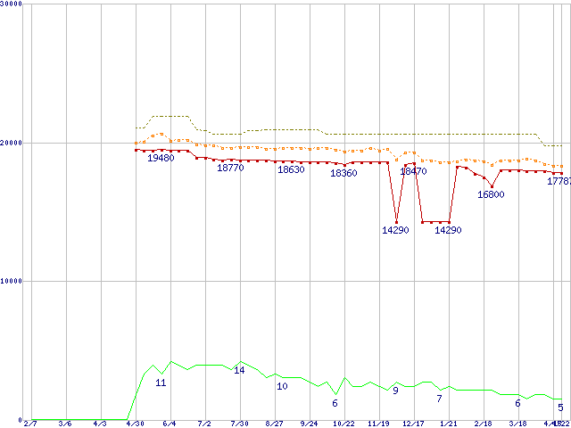 ※このグラフは過去のデータも税率5%相当に調整した税込み相当額のグラフです。 税率変更や、総額表示方式導入(2004年4月)の影響は除いています。 | | | ●凡例 | 最安値 (点線部は販売店未確認 または未調査) | 平均値 | 最高値 | ショップ数 |