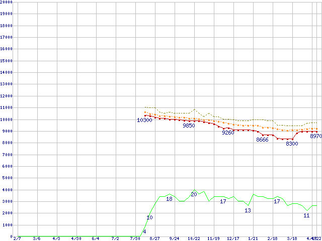 ※このグラフは過去のデータも税率5%相当に調整した税込み相当額のグラフです。 税率変更や、総額表示方式導入(2004年4月)の影響は除いています。 | | | ●凡例 | 最安値 (点線部は販売店未確認 または未調査) | 平均値 | 最高値 | ショップ数 |