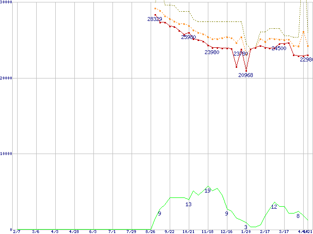 ※このグラフは過去のデータも税率5%相当に調整した税込み相当額のグラフです。 税率変更や、総額表示方式導入(2004年4月)の影響は除いています。 | | | ●凡例 | 最安値 (点線部は販売店未確認 または未調査) | 平均値 | 最高値 | ショップ数 |